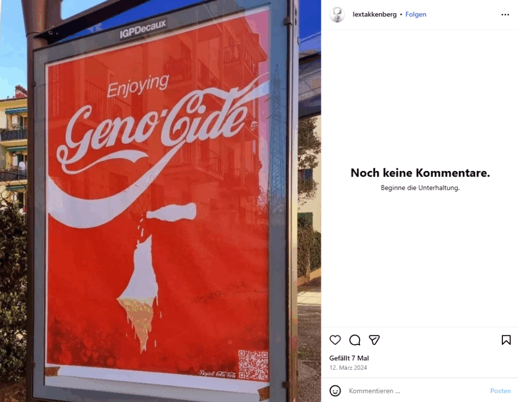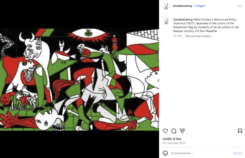 Am 20. Dezember 2023 teilt Takkenberg eine Darstellung von Picasso’s »Guernica«, welche den jüdischen Staat in die Nähe von Faschismus und NS-Verbrechen rückt. Laut IHRA ist genau diese Gleichsetzung ein anerkanntes Beispiel für israelfeindlichen Antisemitismus und Delegitimierung: Solche NS-Vergleiche dienen nicht sachlicher Kritik, sondern emotionaler Moralisierung und Dämonisierung.
