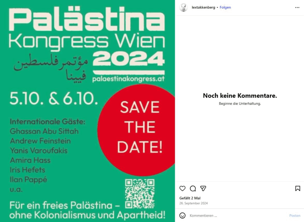Im September 2024 bewarb Takkenberg auf seinem Instagram-Profil den sogenannten „Palästina-Kongress“ in Wien (2024). Die Berichterstattung anerkannter österreichischer Medien (ORF, Der Standard) beschreibt diese Veranstaltung als Treffpunkt radikaler israelfeindlicher und extremistischer Akteure. Laut ORF und Der Standard kamen unter den Vortragenden: