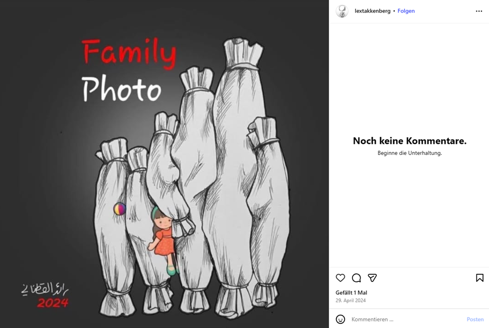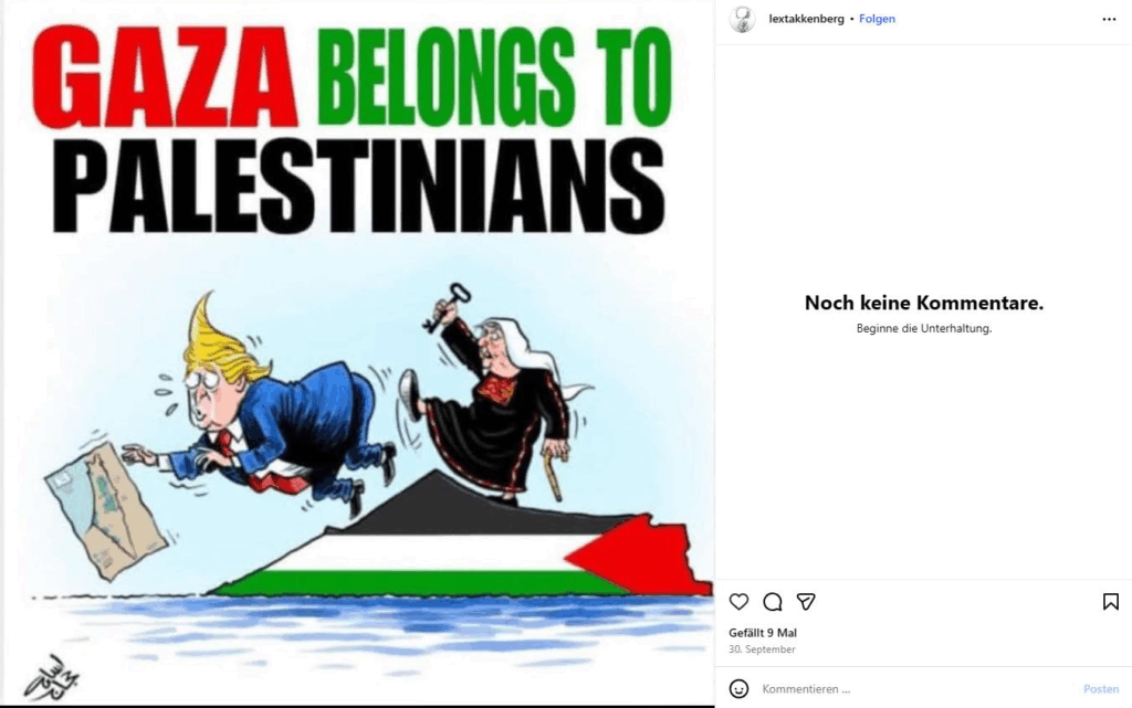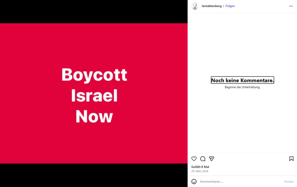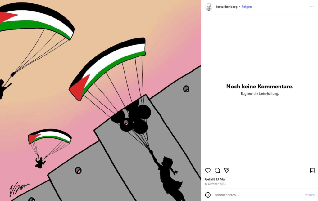Am 8. Oktober 2023, nur einen Tag nach dem Massaker, verbreitete Takkenberg zudem ein Bild von Paraglidern, dem Symbol der Hamas-Terroristen, die auf diesem Weg zur Ermordung, Vergewaltigung und Entführung von Zivilist:innen nach Israel eindrangen. Eine solche Bildsprache unmittelbar nach der Tat ist eine ästhetische Verklärung und Glorifizierung von antisemitischem Terror und Massenmord.