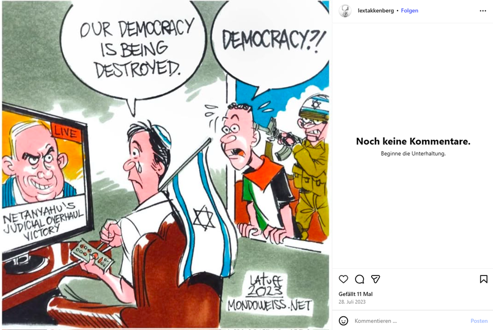 Unter anderem am 28. Juli 2023 teilt Takkenberg einen Cartoon des israelfeindlichen Cartoonisten Carlos Latuff für die Seite Mondoweiss. Latuff ist bekannt für antisemitische Verunglimpfungen und unter anderem Teilnehmer des Holocaust-Karikaturen-Wettbewerbs des iranischen Regimes. Mondoweiß ist ein stark israelfeindlich ausgerichtetes Portal, welches von mehreren Medienbeobachtern u.a. von der Washington Post als antisemitische Hetzseite eingestuft wird.