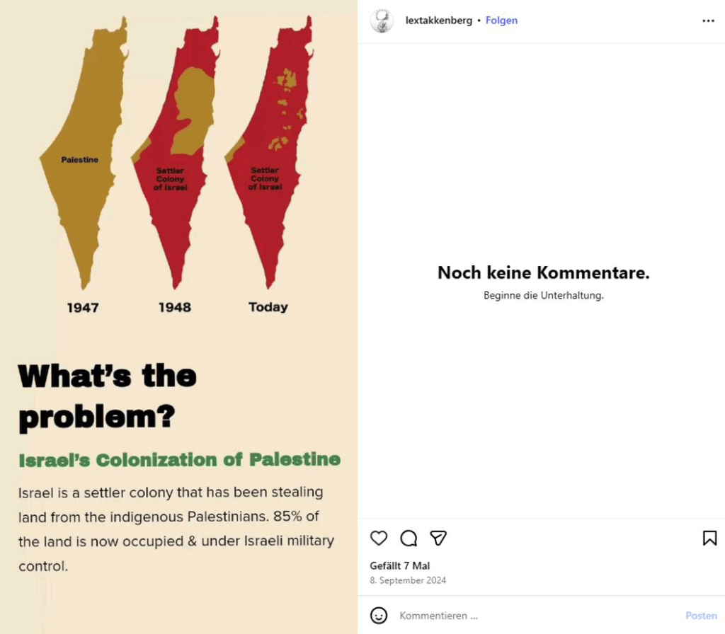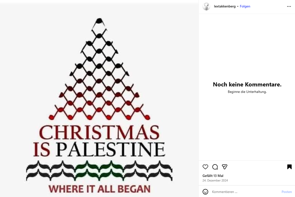 Takkenberg teilt am 24. Dezember 2024 ein Bild mit dem Text: „Christmas is Palestine – where it all began“, gestaltet in palästinensischen Nationalfarben. Das Motiv ist antisemitisch konnotiert, weil es Jüdische Geschichte unsichtbar macht. Die Aussage impliziert, Weihnachten bzw. die Geburt Jesu seien ethnisch-national „palästinensisch“. Tatsächlich war Jesus Jude im vom römischen Reich eroberten Königreich Judäa, und die Bezeichnung „Palästina“ existierte in dieser Form erst deutlich später. Der Ursprung Dies entspricht einem bekannten Muster der historischen Umdeutung, das in der Antisemitismusforschung als „Jewish erasure“ beschrieben wird. Weihnachten wird hier genutzt, um heutige nationale Ansprüche zu transportieren und jüdische historische Kontinuität auszublenden. Im Kontext von Takkenbergs weiteren Inhalten zeigt es ein Muster der symbolischen Verdrängung jüdischer Geschichte und Identität.