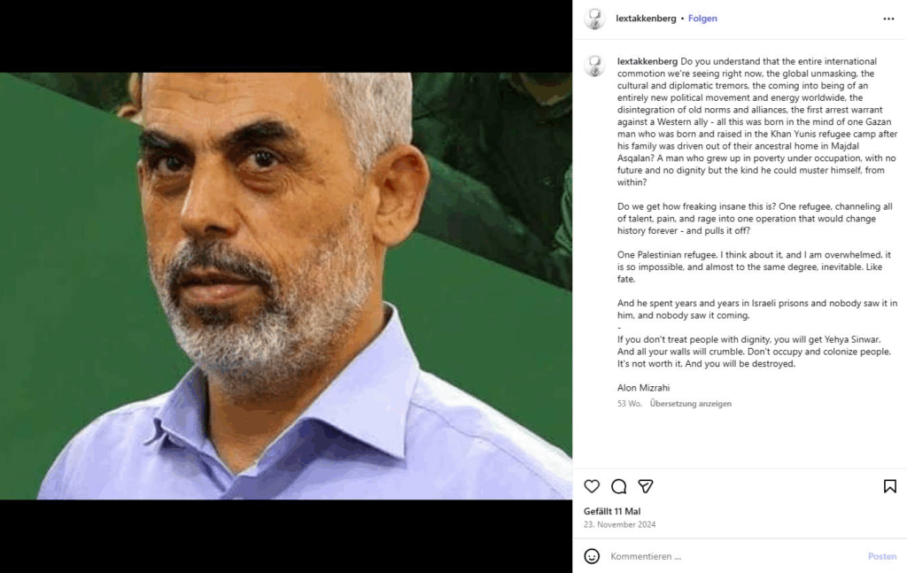 Am 23. November 2024 verbreitete er einen Text, der den Hamas-Führer Yahya Sinwar, einen Hauptverantwortlichen des Massakers vom 7. Oktober 2023, in heroischer, glorifizierender und rechtfertigender Weise beschreibt.