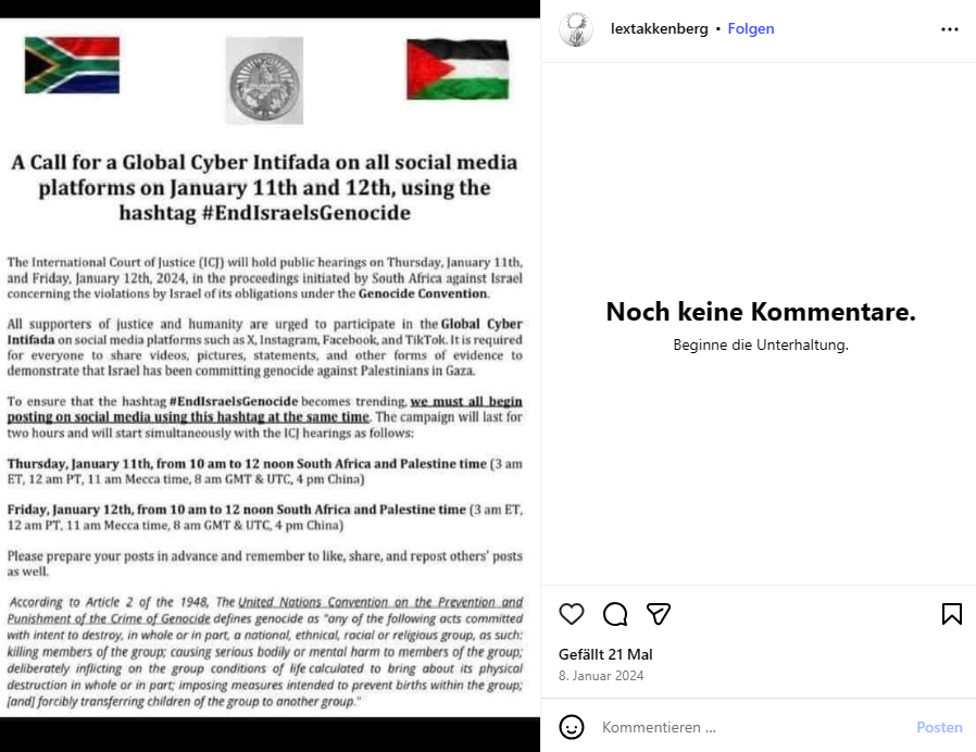 Im Januar 2024 teilt Takkenberg einen Aufruf zur „Global Cyber Intifada“. Der Begriff Intifada ist historisch eng mit Gewalt, Terroranschlägen und gezielten Angriffen auf jüdische und israelische Zivilist:innen verbunden. Besonders die Zweite Intifada (2000–2005) steht für die tödlichste Terrorwelle in Israels Geschichte mit über 1.000 ermordeten Zivilist:innen.